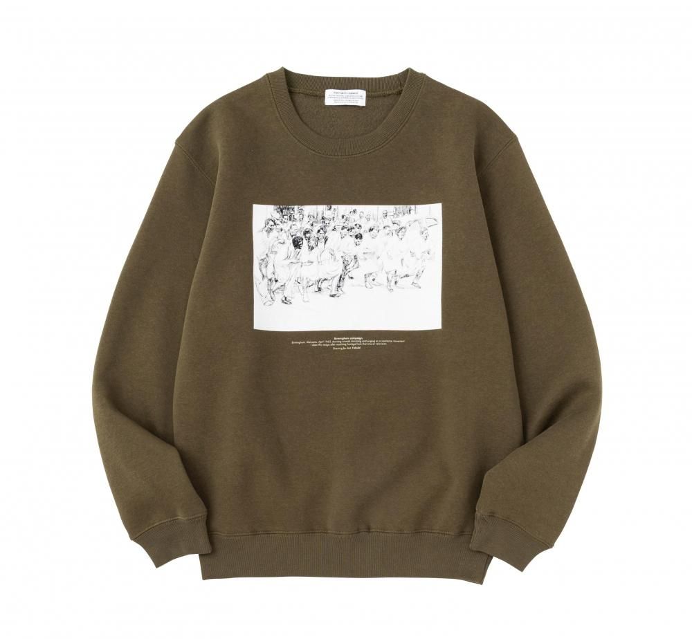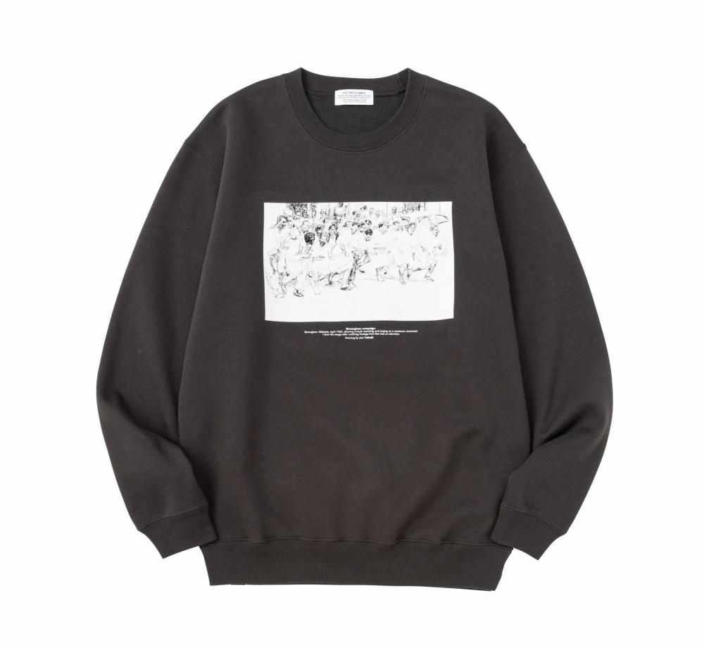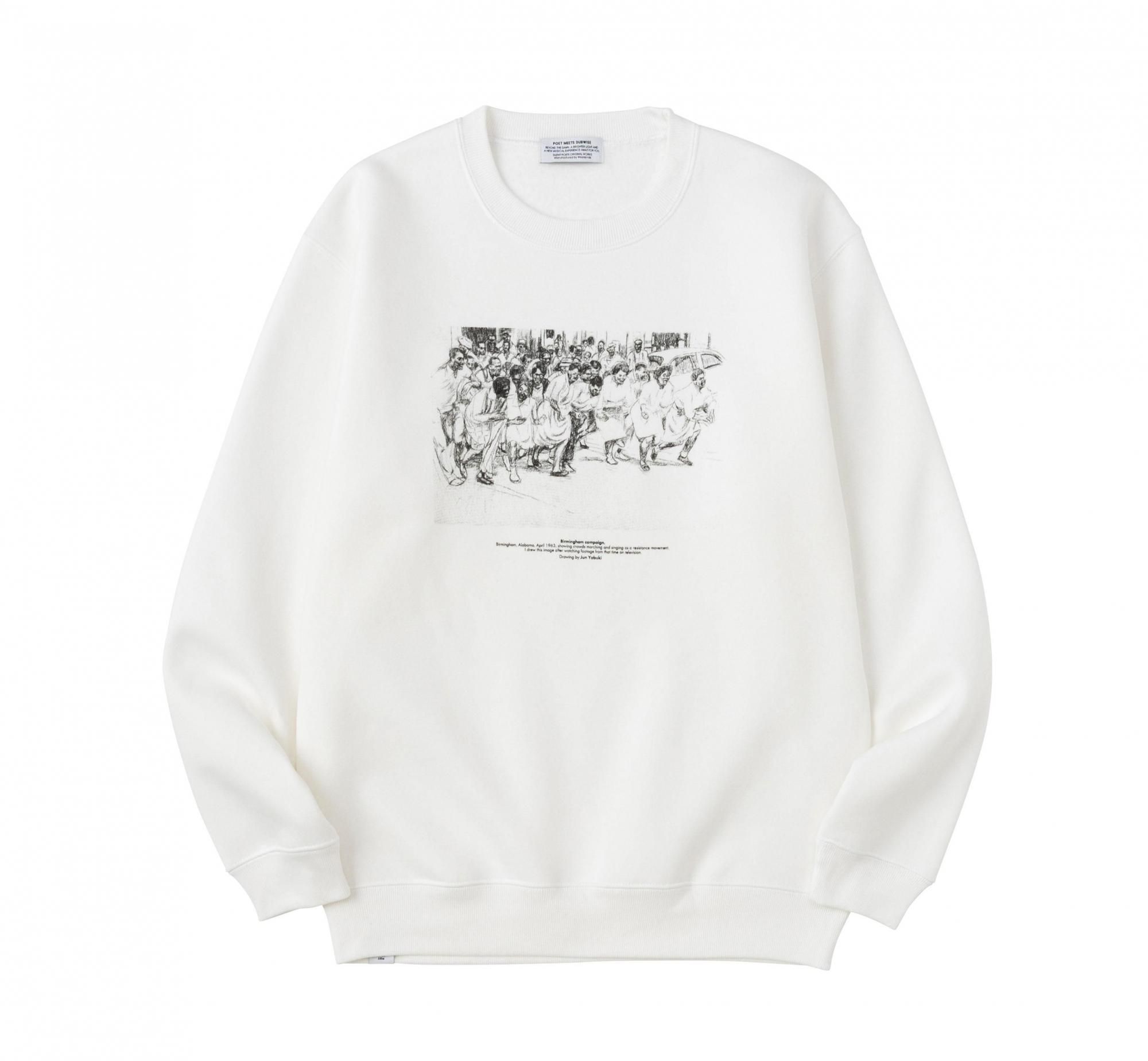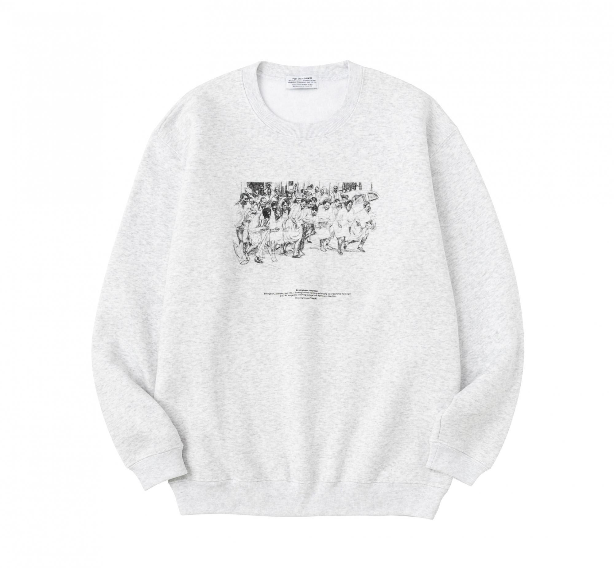 イラストレーターの矢吹純氏とのコラボレーション。フロントにプリントされたイラストは、1963年4月のアメリカ、アラバマ州バーミングハム、抵抗運動として歌いながら行進する群集の様子を描いたもの。綺麗な表面感とソフトな肌触りを追求した10 OZ裏起毛スエット。