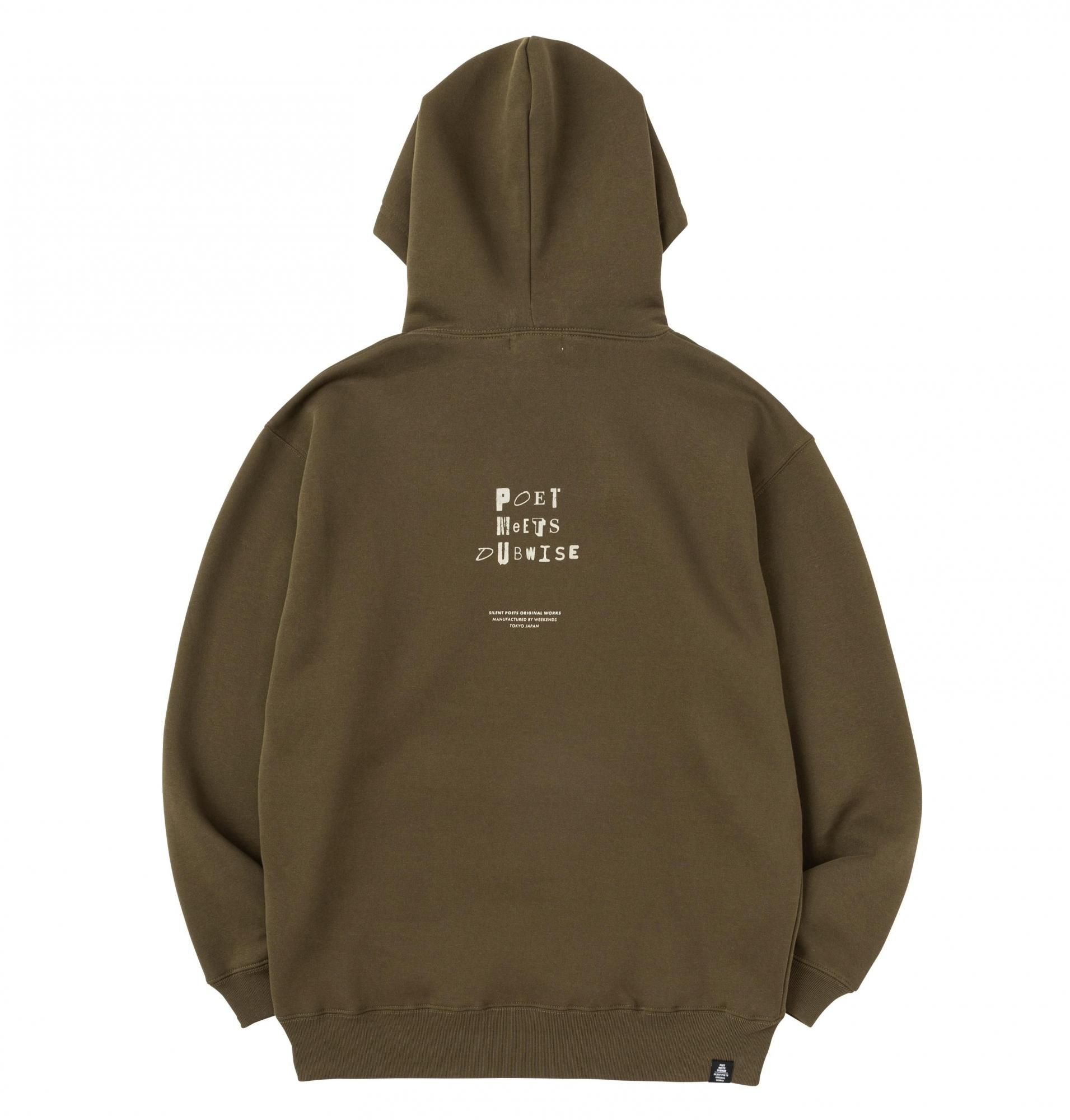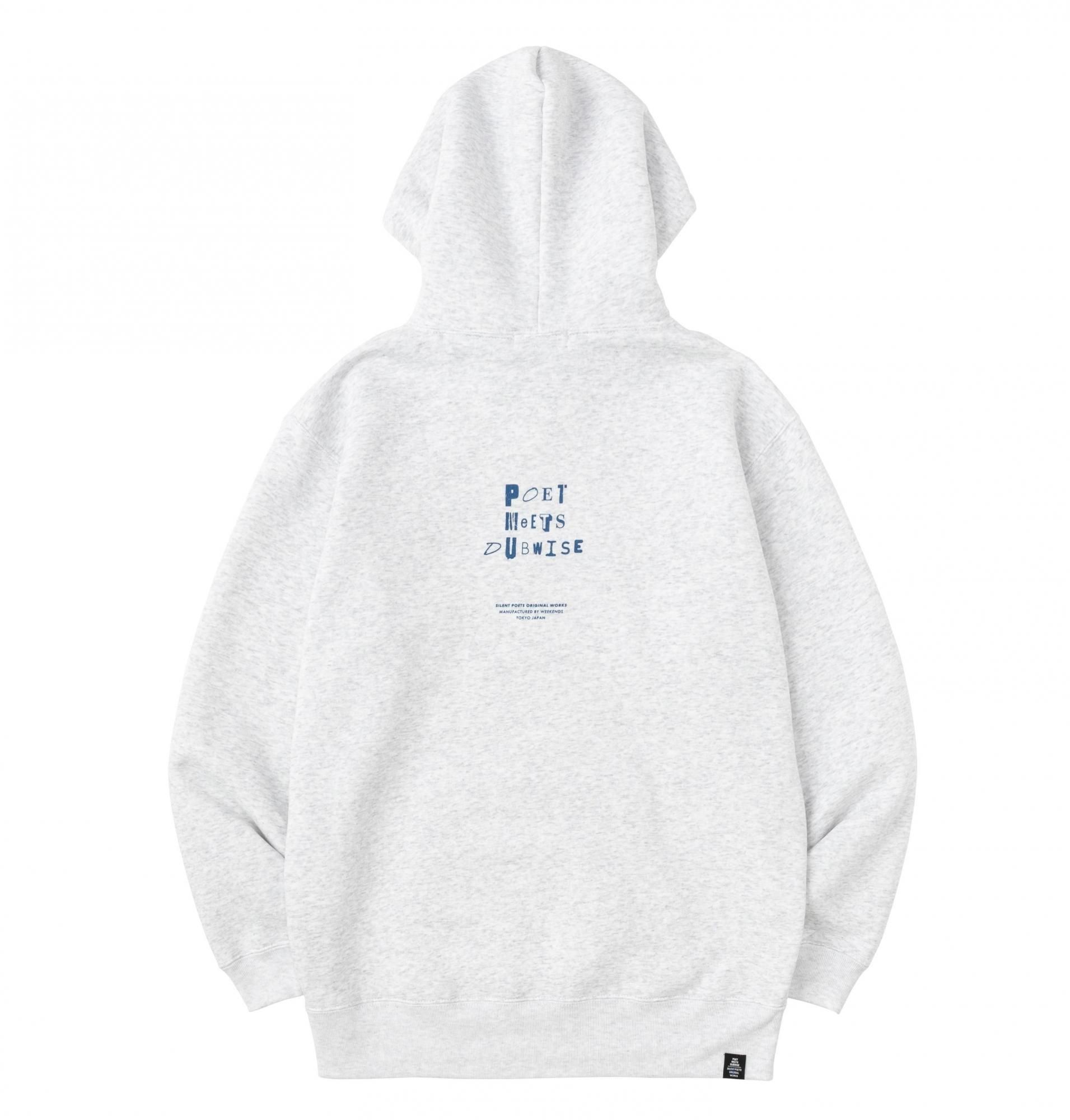 SILENT POETS から連想されるキーワードをプリント。綺麗な表面感とソフトな肌触りを追求した10oz裏起毛プルオーバーフーディ。